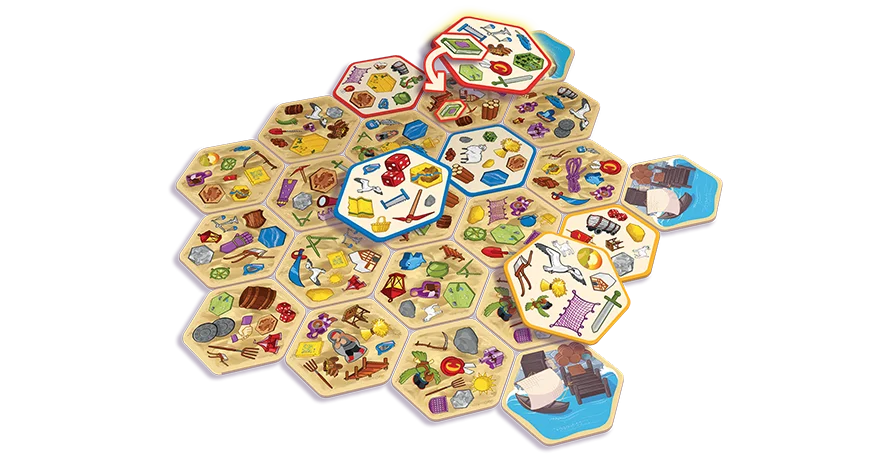Como no podía ser de otra forma, en Dobble Catan, los jugadores compiten por encontrar el símbolo que coincide entre la carta de su mano y las de la mesa y así, poco a poco, ir colonizando la isla y expandiendo su territorio.