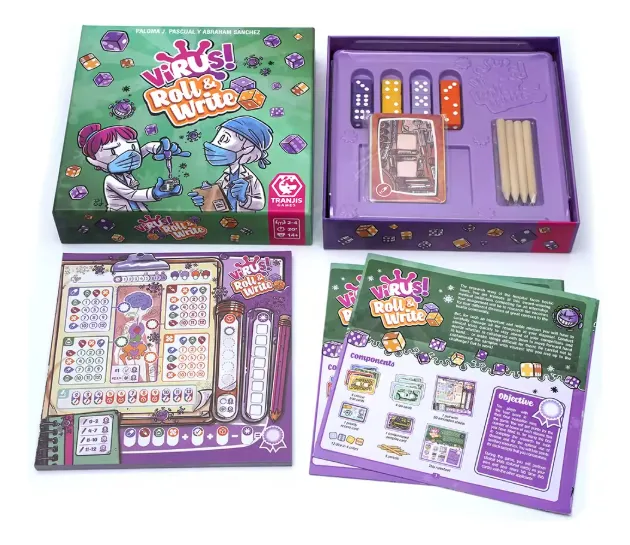 & Free ShippingVirus Roll and White es un juego de mesa ambientado en el juego ¡Virus! Con Virus Roll and White tendrás que lanzar dados y tachar en tu ficha de juego. Os convertiréis en estudiantes en prácticas en el Hospital General y competís para ganar una beca. Vuestro objetivo será investigar las vacunas contra cuatro virus distintos que están amenazando a los sanitarios. Para ello, tenéis que gestionar los recursos disponibles y realizar ensayos clínicos rápidamente para ganar a la competencia (estará en tus manos que trabajéis juntos o que os pongáis las cosas difíciles…) Pero, ¡cuidado! ¡No contamines las muestras con virus! Lanzarás los dados en cada ronda para colocarlos sobre las cartas y así poder tachar las casillas en tu hoja de juego. Ganarás puntos según las casillas tachadas y por maximizar tus recursos.