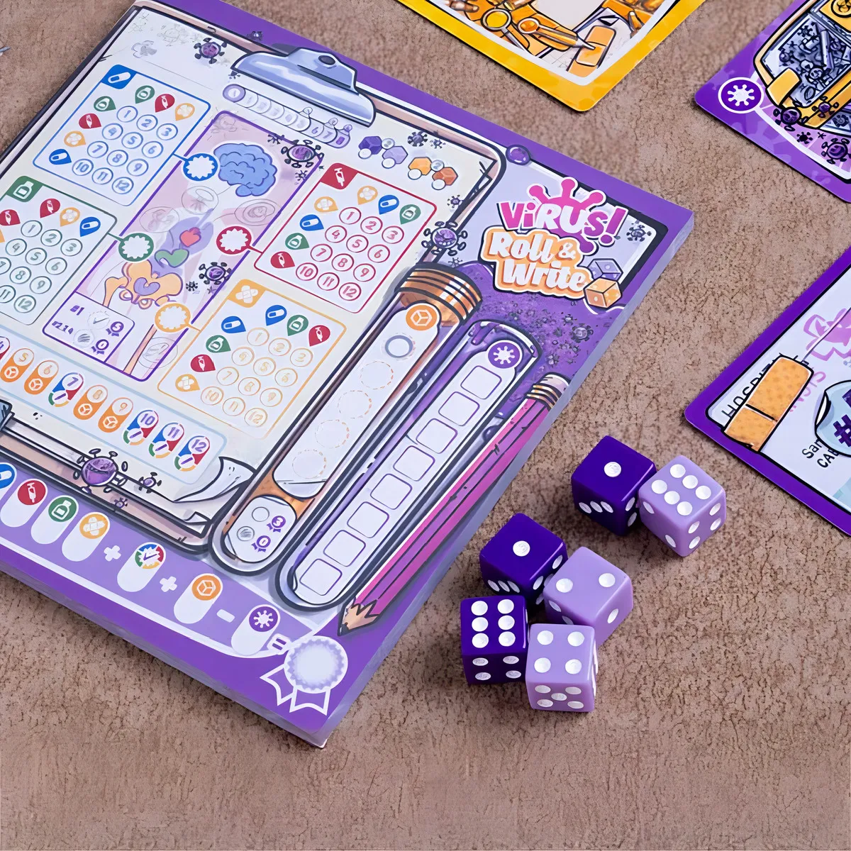 Durante una partida a Virus!Roll & Write tendrás que realizar ensayos clínicos, colaborar en el laboratorio o incluso poner las cosas difíciles a tus rivales. En cada ronda lanzarás los dados para colocarlos sobre las cartas y poder tachar casillas en tu hoja de juego. Obtendrás puntos por casillas tachadas y haber optimizado tus recursos. Os damos la bienvenida a esta nueva aventura del universo Virus! en formato Roll&Write.